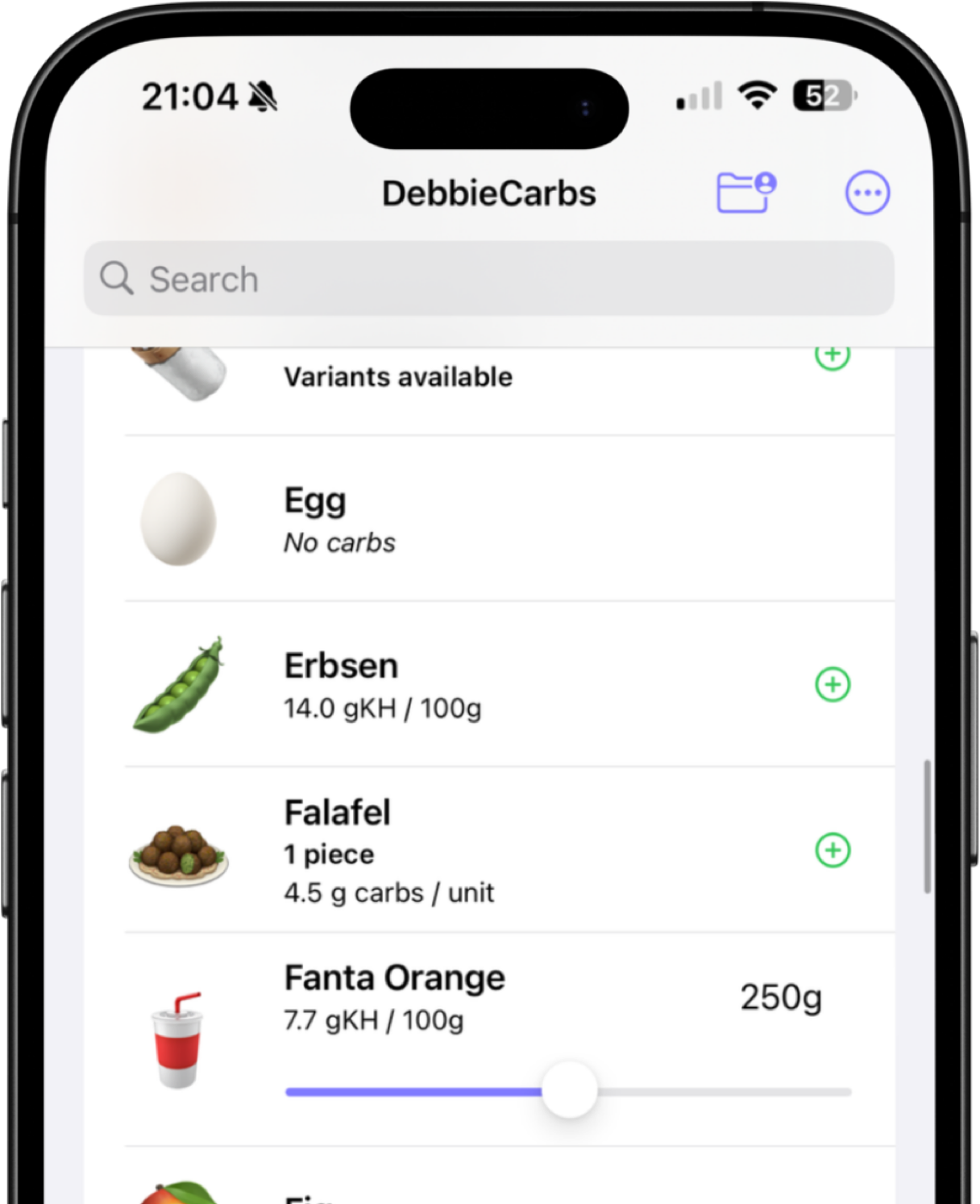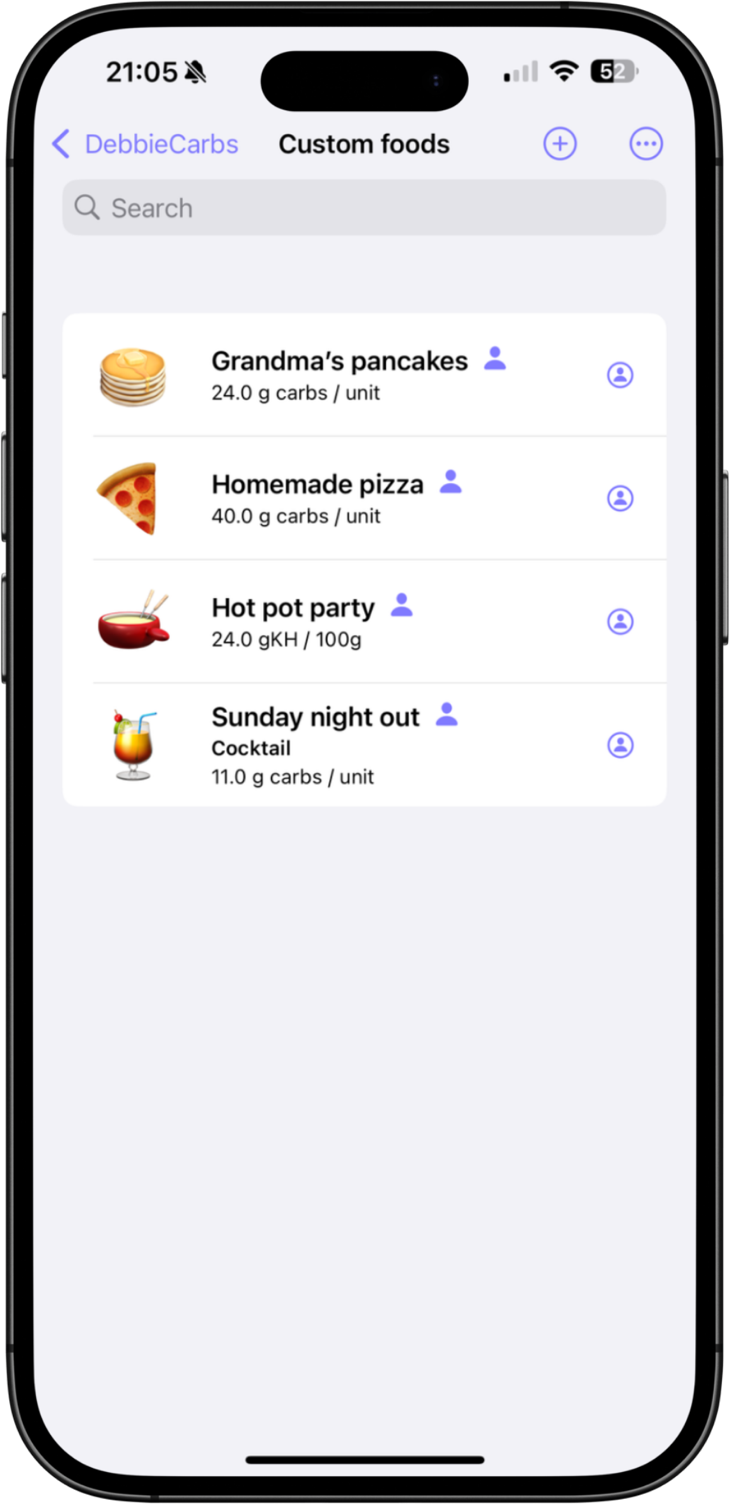 In addition to the pre-stored and constantly updated food database, you can also create your own entries.