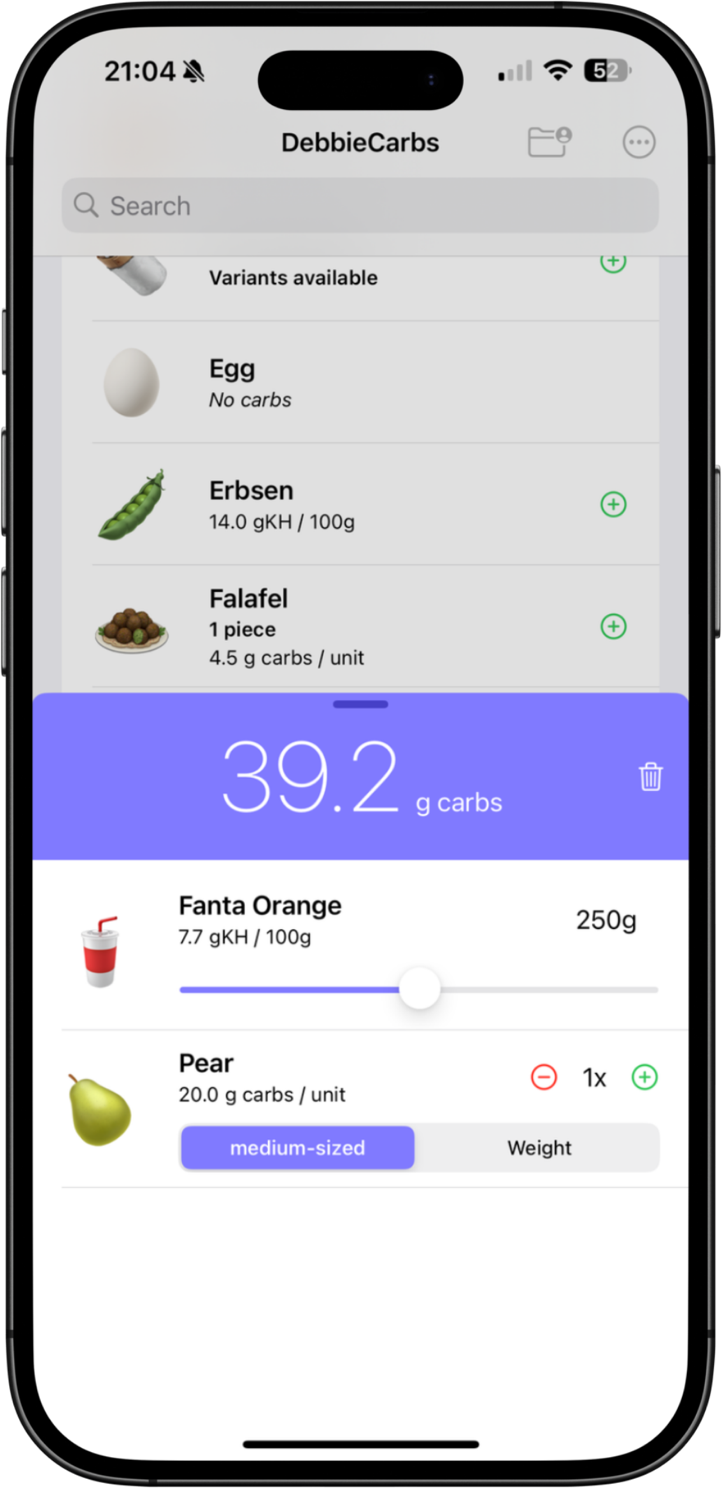 The total carbohydrate sum is automatically updated, and the foods added to the meal are listed in a shopping cart.